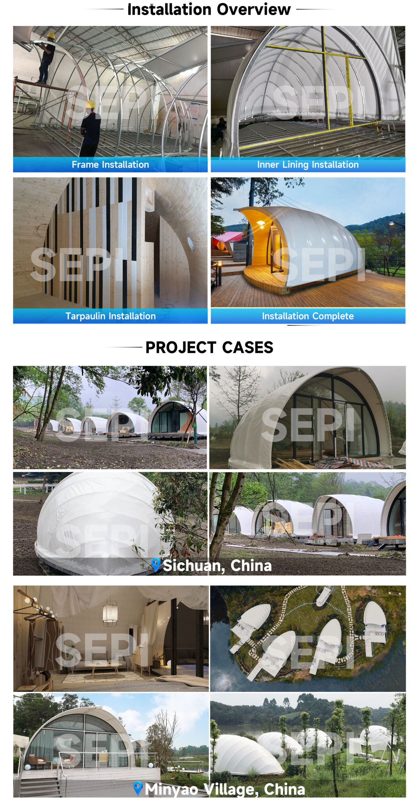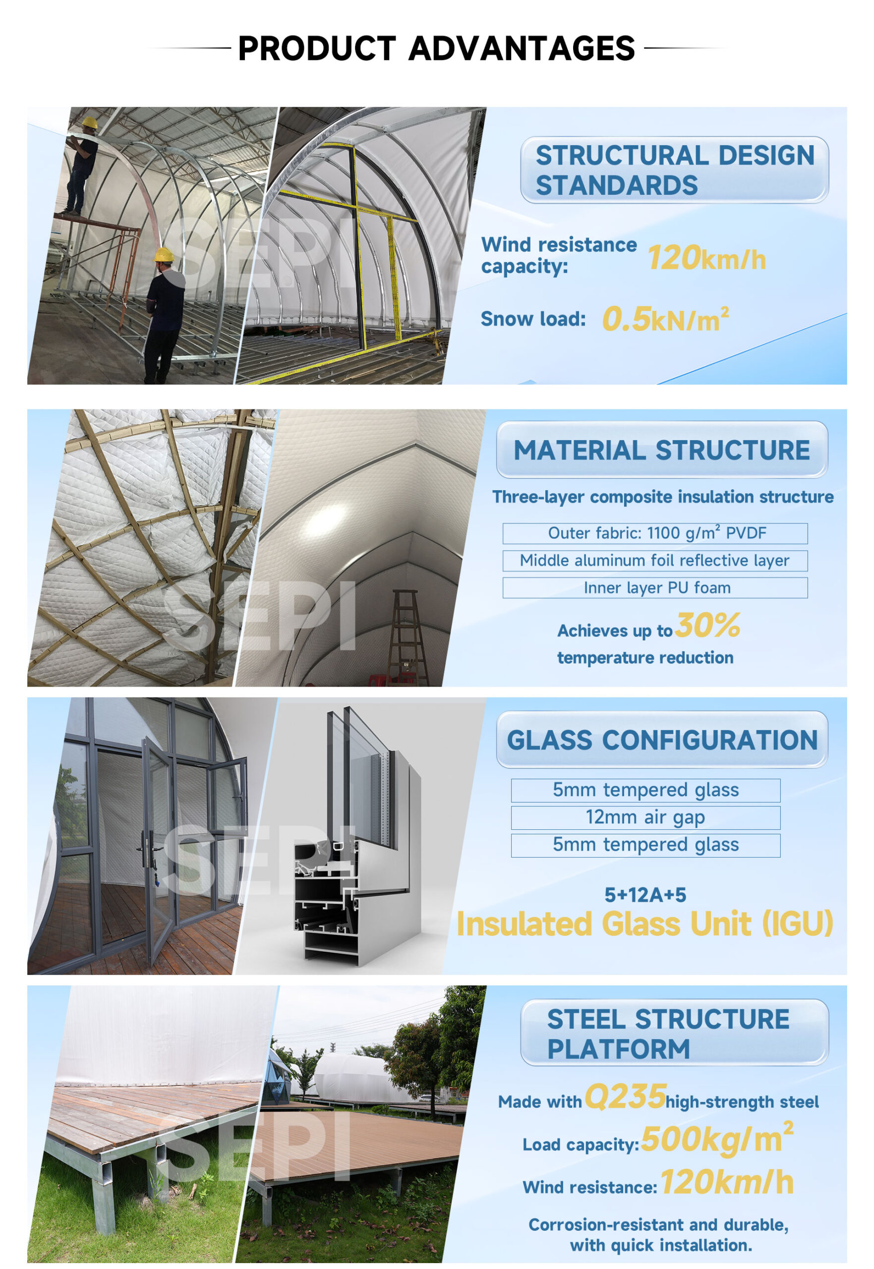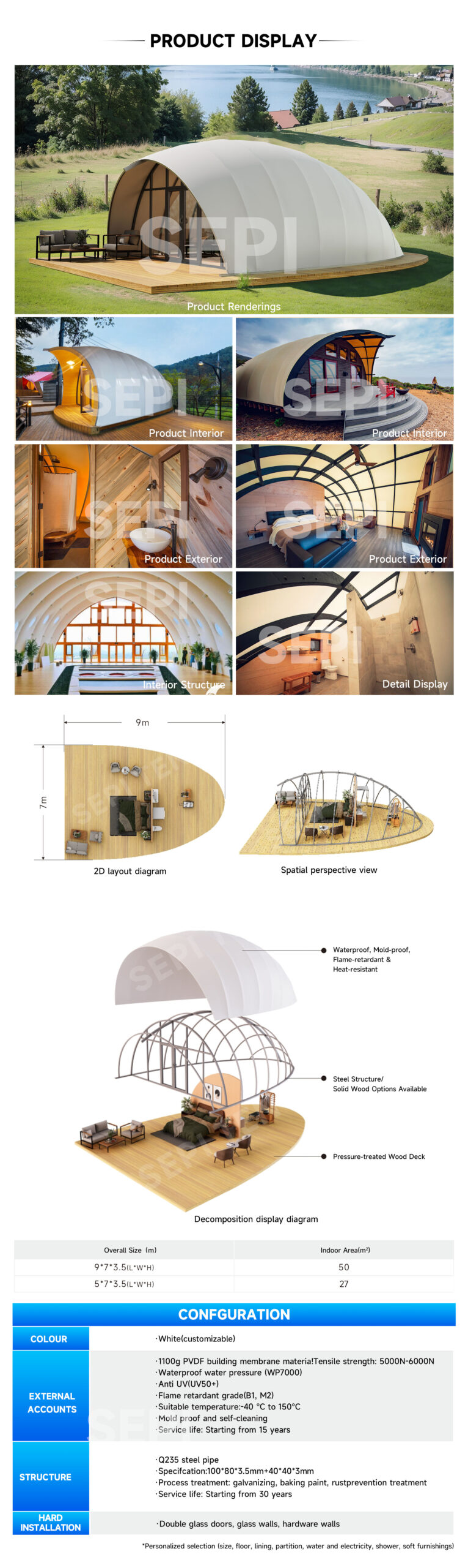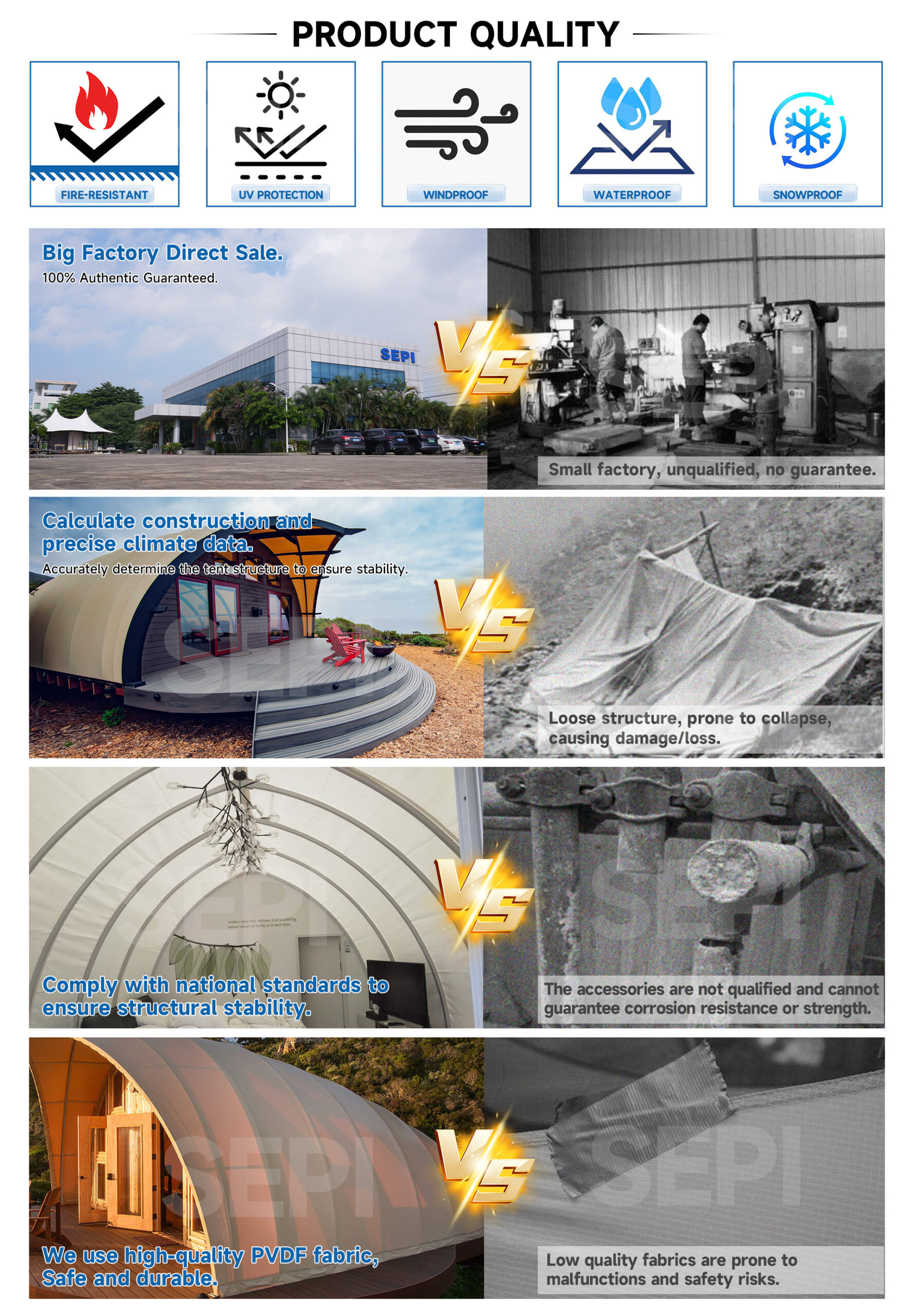 2.Unrivaled Durability for Decades: Constructed with a robust Q235 steel frame and a premium 1100g/㎡ PVDF membrane, this tent is engineered for longevity, boasting a lifespan of 15+ years. This superior material combination ensures exceptional waterproofing,UV protection, and B1/M2 flame retardancy, alongside mold resistance, guaranteeing a secure and comfortable stay in any climate.