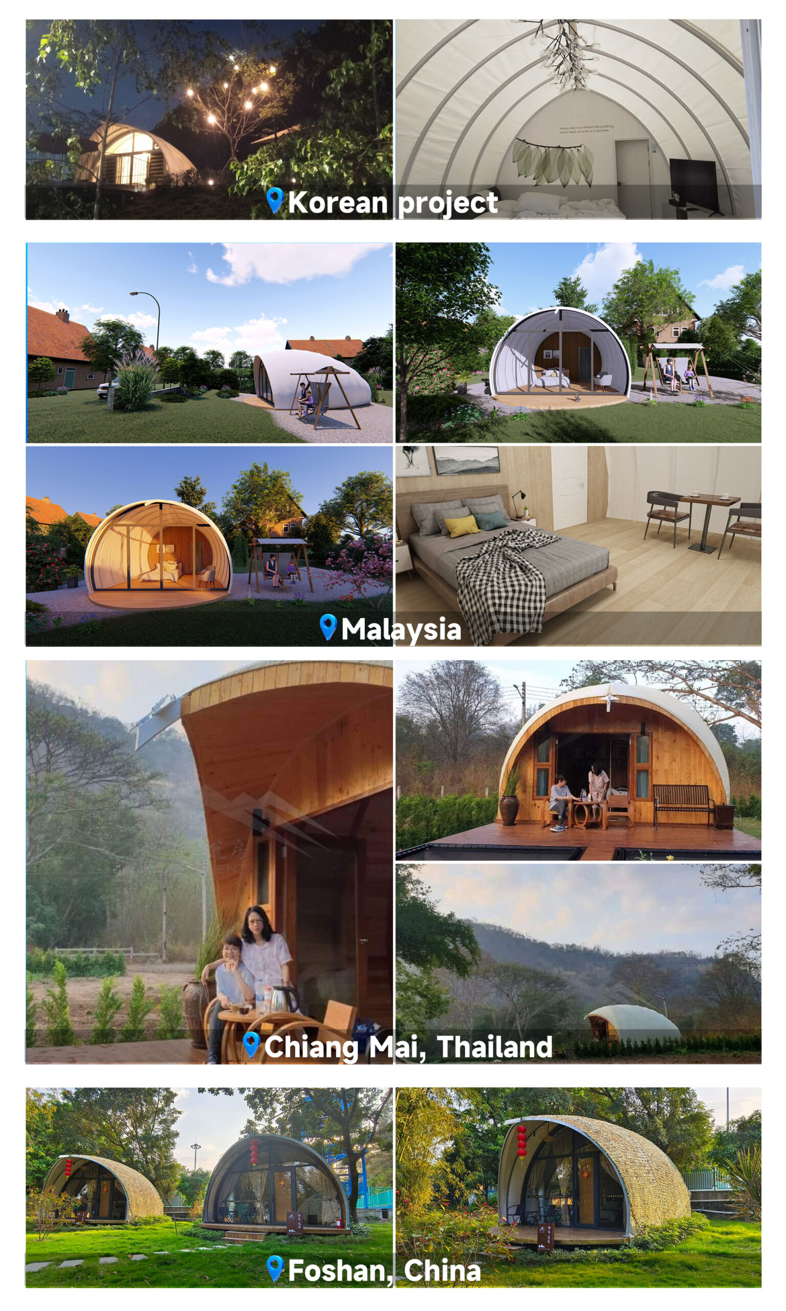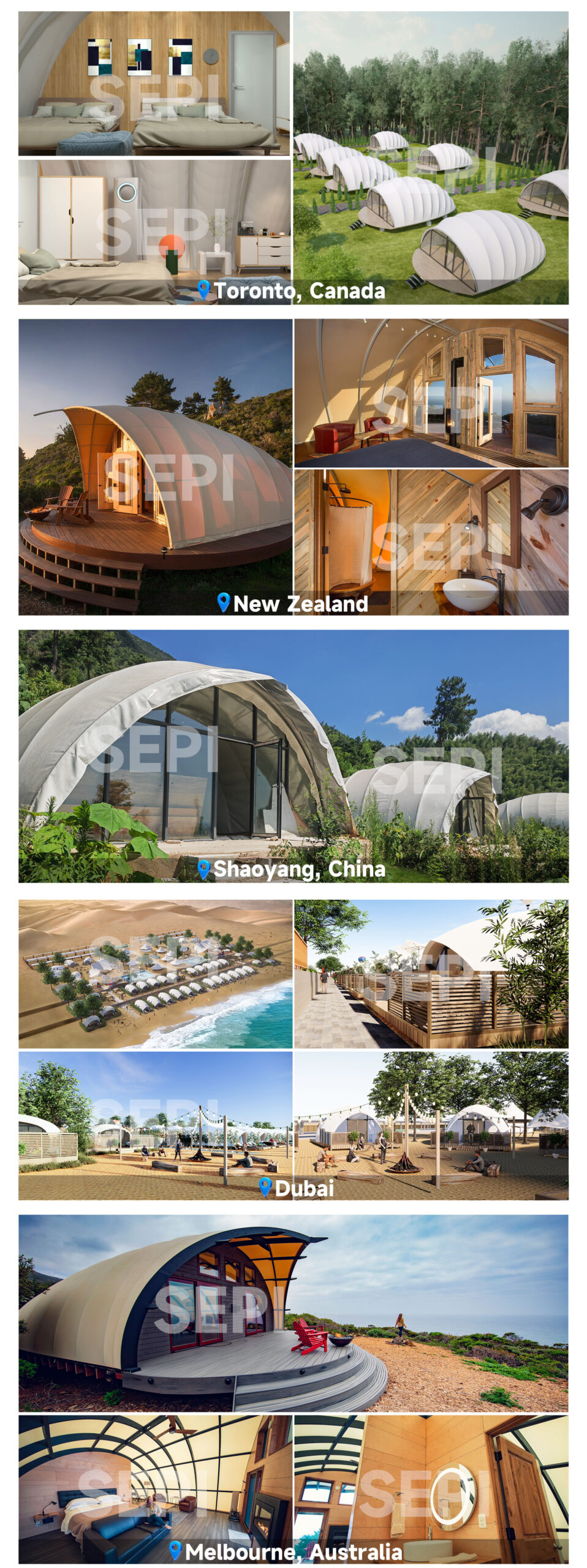 1.Unique Design: Inspired by a protective shell, its streamlined form blends seamlessly with nature, offering an immersive glamping experience that deeply connects guests with their surroundings.