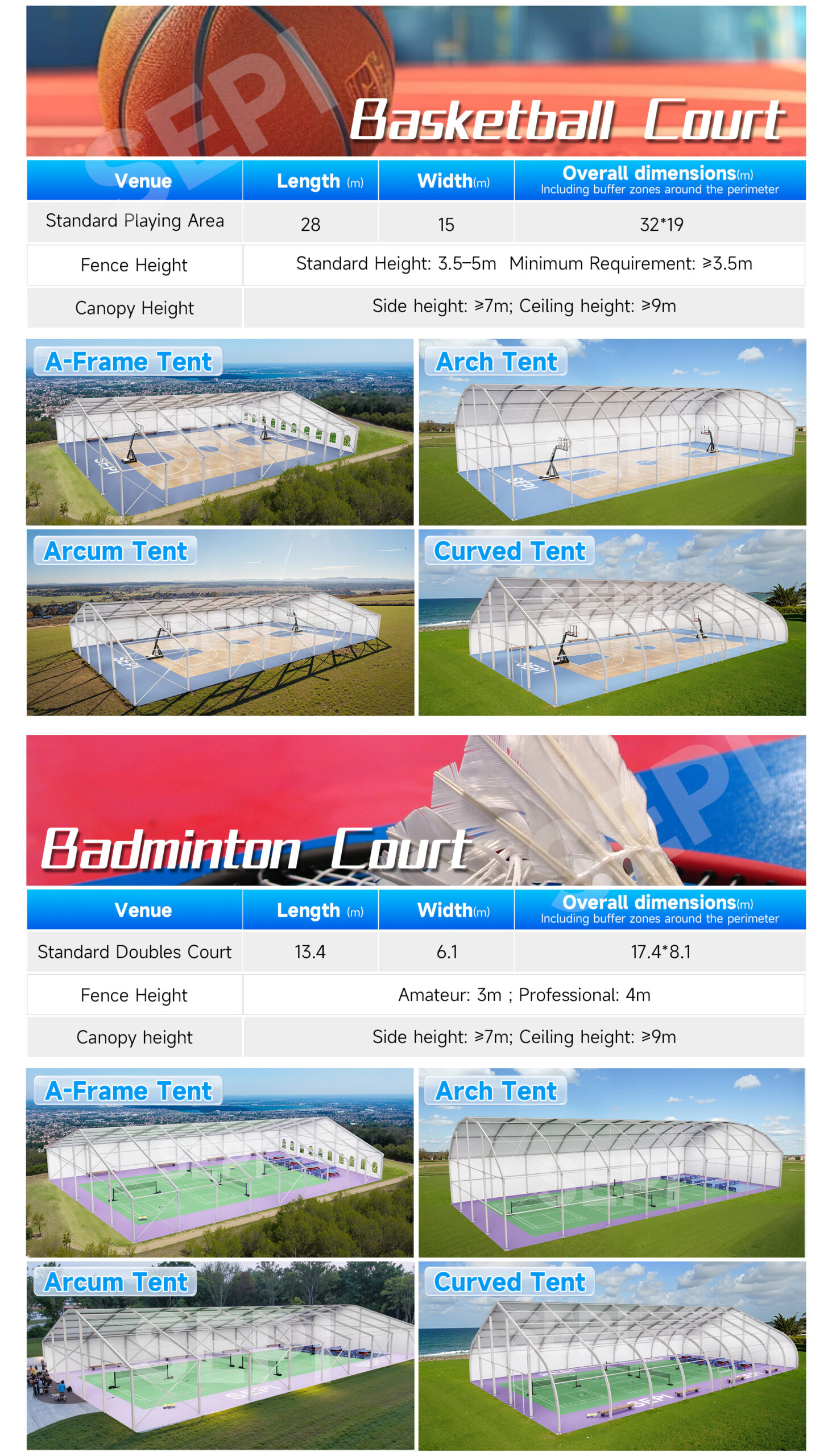 Sport Court Tent Lorem ipsum dolor sit amet, consectetur adipiscing elit. Donec vestibulum lorem nec ultricies . Sport Court Tent Frame material : High-strength Aluminum Alloy 6061/T6. Fabric cover :850g/㎡ White PVC tarpaulin or 1100/㎡ White PVDF membrane Sidewall :PVC Wall, Glass Wall, ABS Wall, Sandwich Wall Service Life : More than 15 years Name Email Message Send